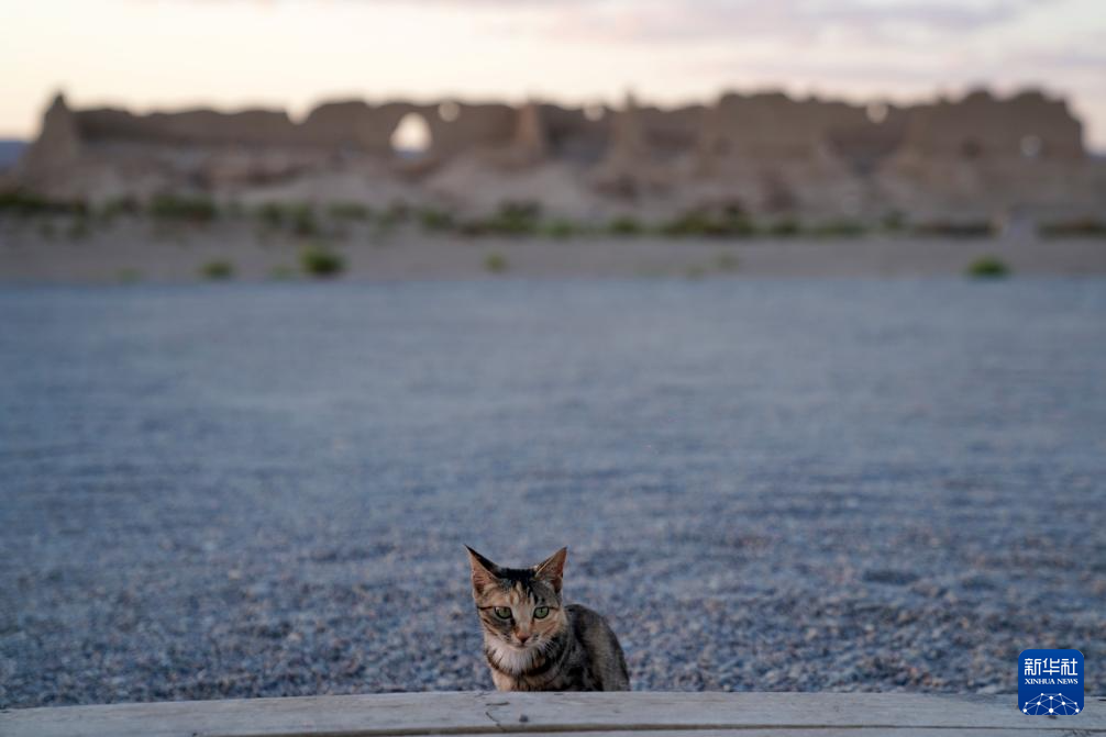 7月16日,一只小猫蹲在甘肃省敦煌市玉门关遗址区的大方盘城前。