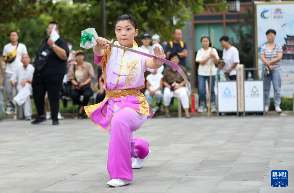 9月8日,一名武术爱好者在南川楼文化街区表演双剑。