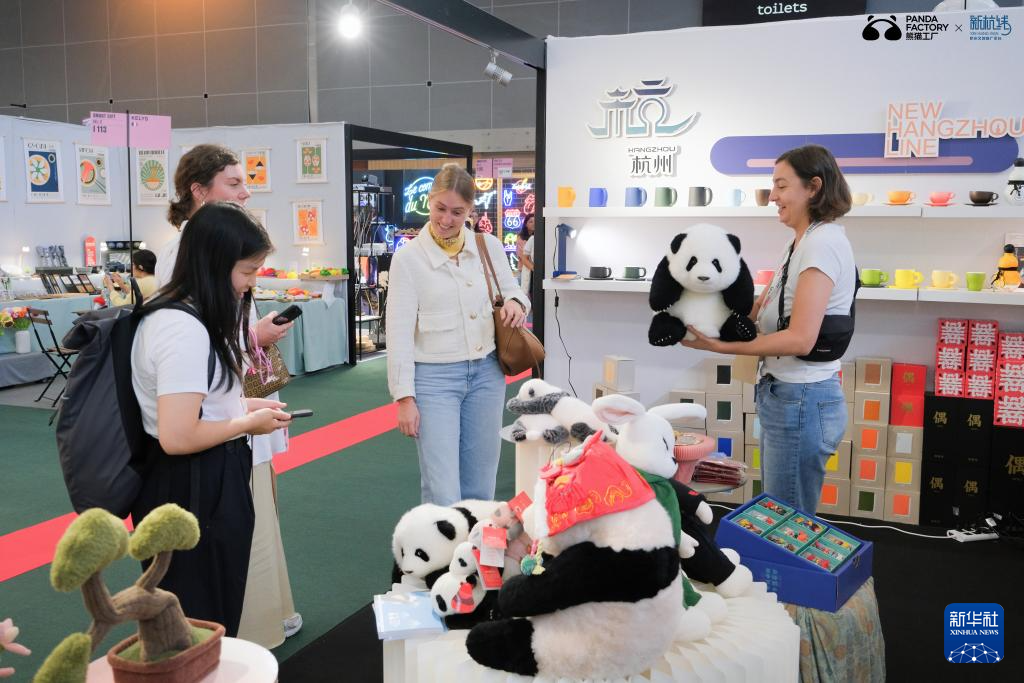 在2024巴黎设计周上,外国观众在欣赏“熊猫工厂”出品的高仿真大熊猫玩偶产品(9月5日摄)。
