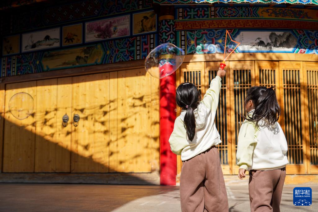 12月8日,两名小朋友在官渡古镇玩泡泡。