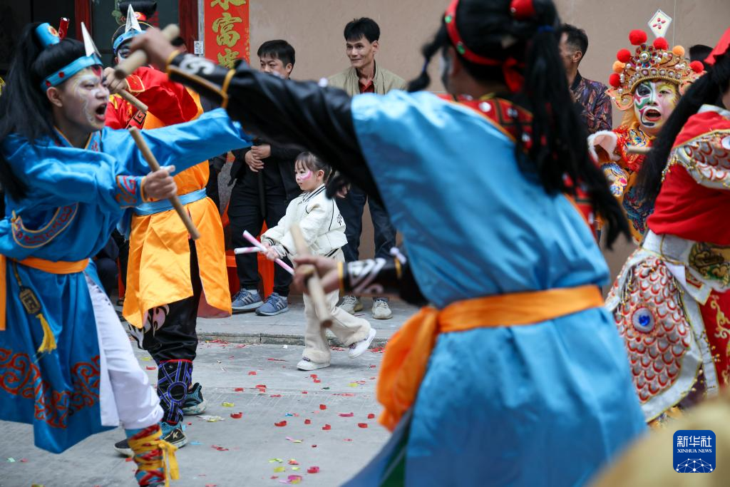 12月9日,广东省汕头市潮阳区贵屿镇玉窖村举办民俗活动,5岁女童庄恩琪手持英歌槌,跟随鼓点节奏与当地的英歌队员一同起舞,动作有力且充满韵律,赢得了在场观众阵阵掌声。