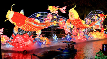 1月16日,小朋友在河北省群众艺术馆迎新春民俗文化展活动中悬挂灯笼。