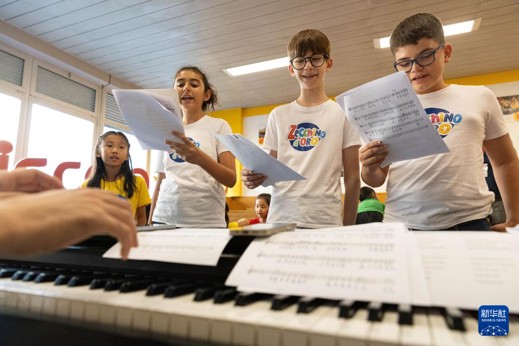 7月18日,在意大利博洛尼亚,绣球花小合唱团与安东尼亚诺小合唱团的团员们一起练习歌曲。