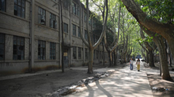 杜德建推开位于山西省永济市卿头镇张坊村的张坊学校大门(9月9日摄)。由于家中图书越来越多,2015年,杜德建租下村里学校闲置的几间房屋用于存放图书、报刊。
