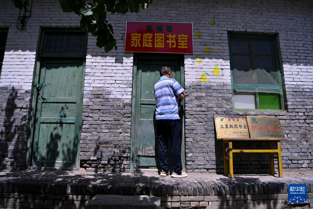 在位于山西省永济市卿头镇张坊村的张坊学校内,杜德建打开图书室的房门(9月9日摄)。由于家中图书越来越多,2015年,杜德建租下村里学校闲置的几间房屋用于存放图书、报刊。
