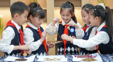 10月22日,在江苏省泰州市姜堰区实验小学教育集团北街北校区,学生体验称量中草药。