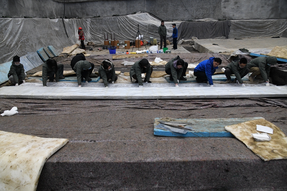 再比如,在安徽淮南武王墩一號墓考古項目中,國家文物局考古研究中心負責出土文物現場保護與多學科研究,在技術、方法上也做了一些新的探索。現場保護方面,我們將薄荷醇應用于潮濕環境,成功提取了200余平方米覆蓋在槨蓋板上的竹席,是目前國內外開展的面積最大的古代竹席提取工作。首次采用水凝膠、環氧樹脂碳纖維布復合材料配合套箱技術,在田野考古發掘現場完成大型文物加固提取。
