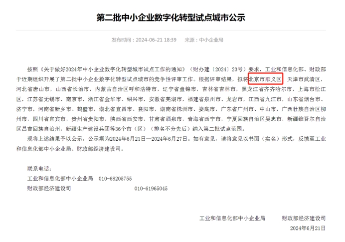 日前,工信部、财政部联合公示了第二批中小企业数字化转型试点城市名单,顺义区凭借雄厚的产业基础和突出的数字化转型特色优势成功入选,成为全国推动中小企业数字化转型的先行示范区。