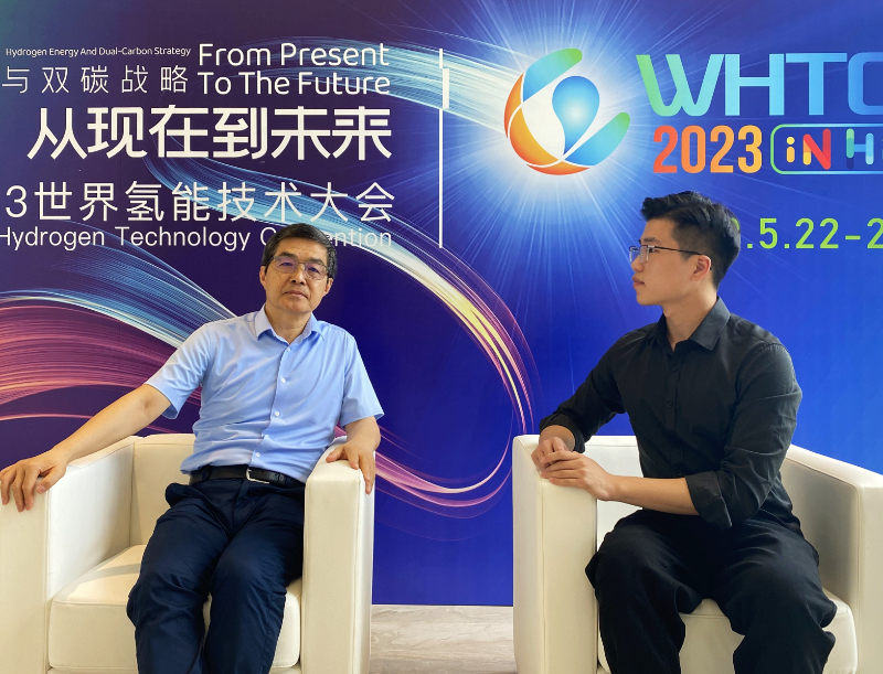 图为中国科学院院士,清华大学教授,国际氢能燃料电池协会理事长欧阳明高(左)接受新华网采访