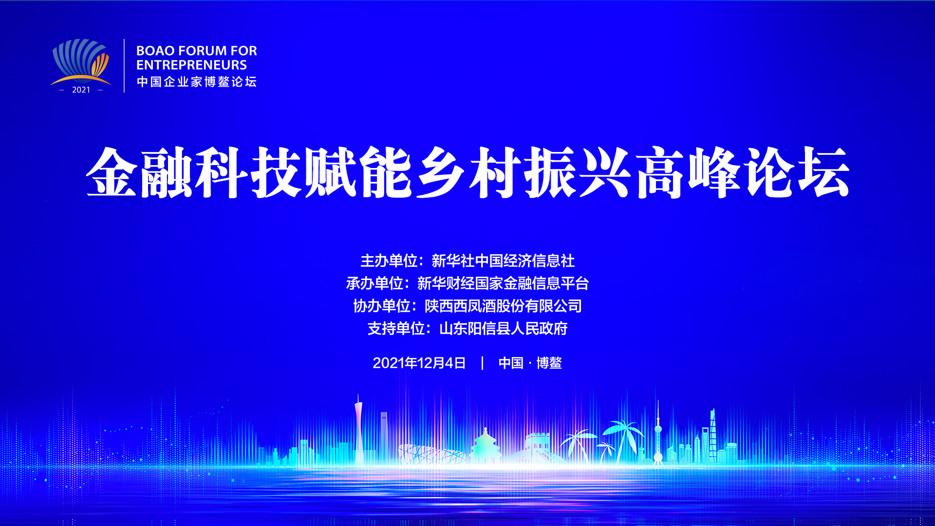 2021年是“十四五”开局之年,是实施乡村振兴战略的发力之年。为发挥金融科技的技术、渠道等优势,撬动更多社会资源投入到乡村振兴伟大事业,中国经济信息社在2021中国企业家博鳌论坛期间,于12月4日下午举办金融科技赋能乡村振兴高峰论坛,邀请相关主管部门领导、专家学者、企业高管等嘉宾,共同探讨金融科技赋能乡村振兴路径,共话乡村振兴新机遇、新模式、新思路,全面助力乡村振兴。本届论坛由陕西西凤酒股份有限公司协办,山东阳信县人民政府支持。