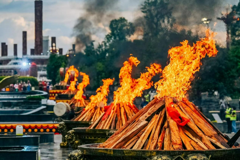 广场上,一簇簇数米之高的巨型火把矗立