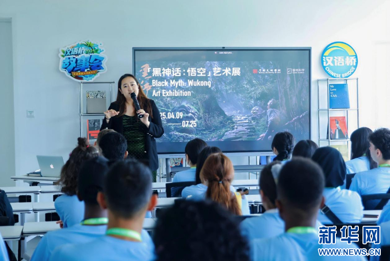 2025“汉语桥”全球外国人汉语大会故事会复赛及决赛将于7月6日至9日在杭州电子科技大学举办。晋级复赛的50名选手相聚杭州,以中文为桥讲述精彩故事。图为7月3日“汉语桥”选手在《黑神话:悟空》艺术展现场参加故事分享会。新华网发pagebreak