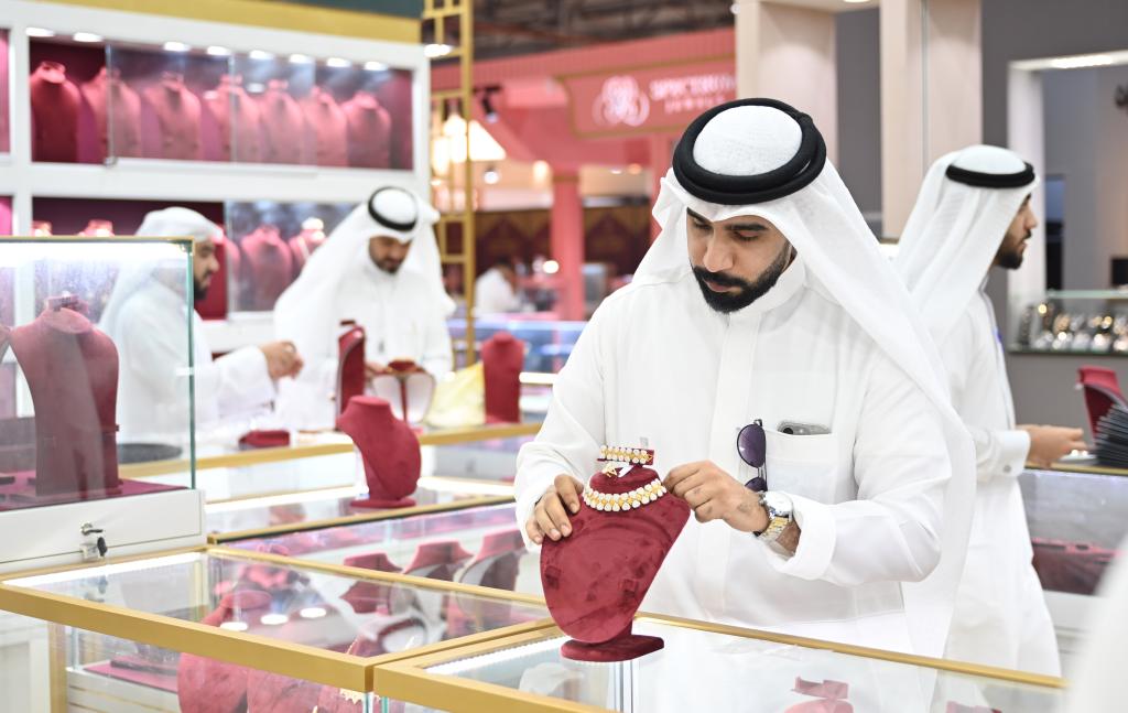 10月7日,在科威特哈瓦利省,一名男子在珠宝展上展示饰品。