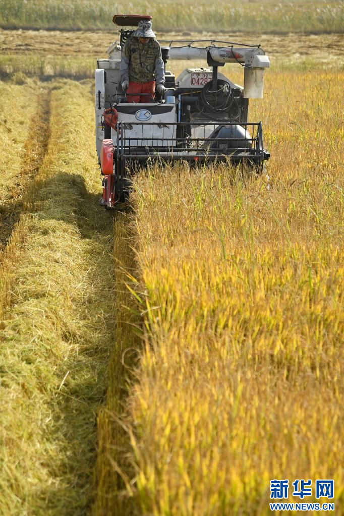 收割机在宁夏石嘴山市平罗县绿康林家庭农场收获水稻(9月30日摄)。 金秋时节,宁夏石嘴山市平罗县迎来水稻收获季。当地百姓利用晴好天气抢收水稻。据了解,2021年平罗县种植水稻24.89万亩,全县水稻生产机械化水平达到98%以上。 新华社记者 王鹏 摄