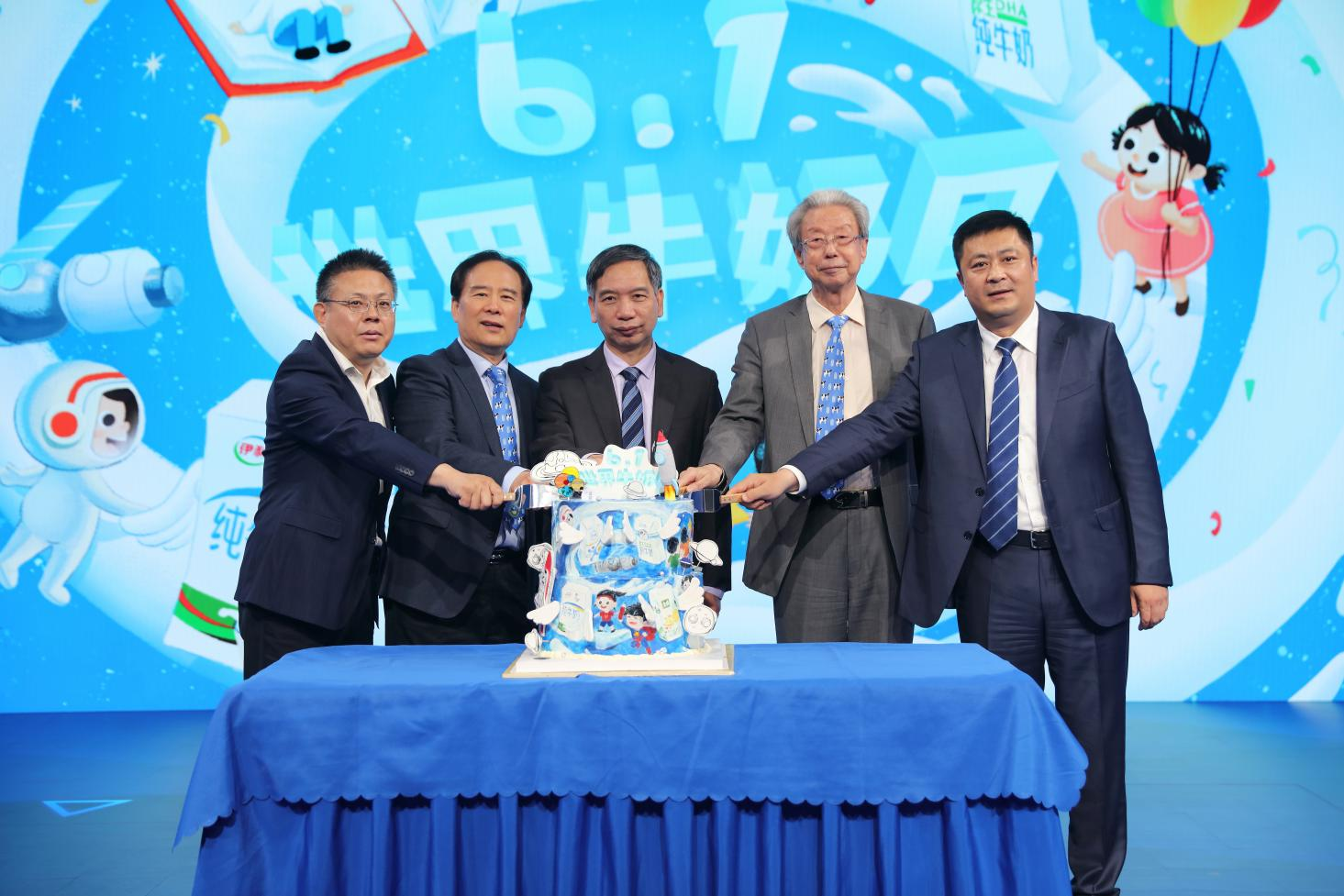 (左起)新华网总裁助理徐明伟,中国乳制品工业协会副理事长刘超,中国疾控中心营养与健康所所长丁刚强,国际乳品联合会中国国家委员会名誉主席、中国乳制品工业协会原理事长宋昆冈,伊利集团执行总裁刘春喜一起庆祝“世界牛奶日”