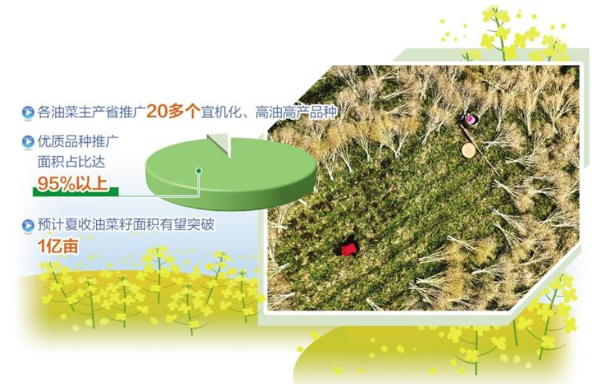 中央财政今年安排产油大县奖励、耕地轮作、绿色高质高效行动等项目资金30多亿元专项支持油菜生产,有效调动了地方政府重农抓油和农民务农种油的积极性。各油菜主产省压实油菜扩种任务,确保政策资金落实到位,大力推广20多个宜机化、高油高产品种,初步统计优质品种推广面积占比达95%以上。据农业农村部农情调度,预计夏收油菜籽面积有望突破1亿亩。