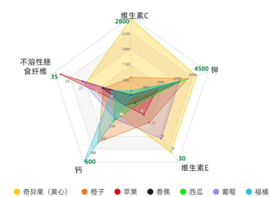 今年全民营养周期间,中国营养学会正式发布了《食物营养素密度概念和健康价值报告——全民健康体重的食物选择指南》(以下简称《指南》),通过雷达图等可视化工具,以直观面积对比的方式呈现各类常见食物的营养素密度,帮助公众迅速判断不同食物的营养健康价值。其中,在常见水果营养素密度对比中,黄心奇异果的营养素密度名列前茅。