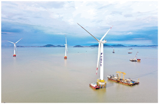 華電福清海壇海峽海上風(fēng)電項目首臺海上風(fēng)電主控系統(tǒng)國產(chǎn)化機組(右)(2021年5月28日攝,無人機照片)。新華社記者姜克紅攝