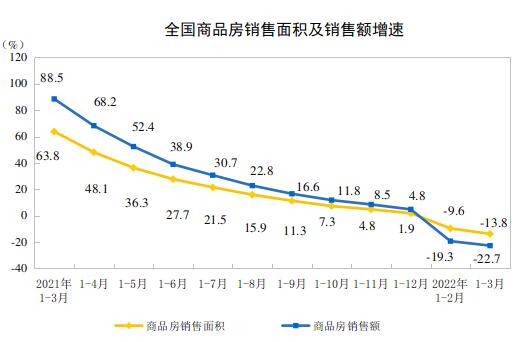 1—3月份,商品房銷售面積31046萬平方米,同比下降13.8%;其中,住宅銷售面積下降18.6%。商品房銷售額29655億元,下降22.7%;其中,住宅銷售額下降25.6%。
