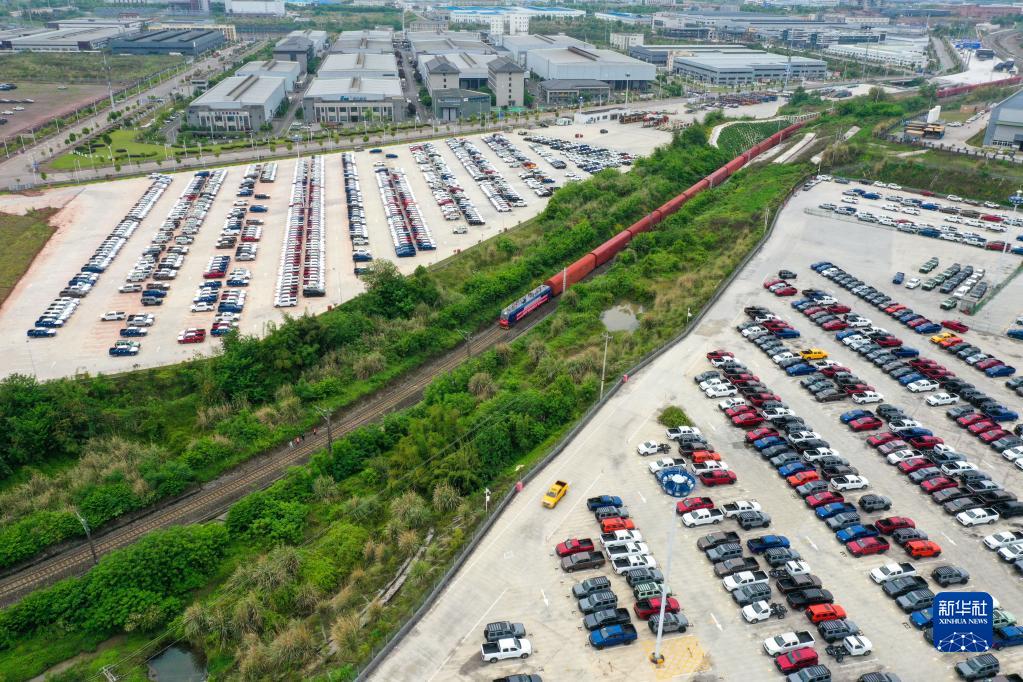 4月14日,長城汽車專列首發列車行駛在重慶永川國家高新區鐵路專用線上(無人機照片)。新華社記者 唐奕 攝