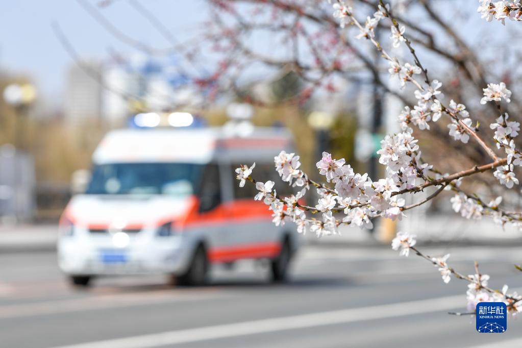 4月14日,一輛救護車在吉林市松江東路上駛過,路邊桃花已經盛開。新華社記者 張楠 攝