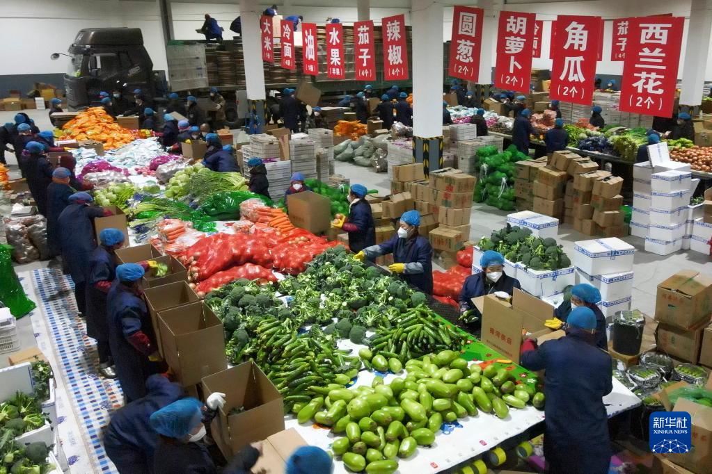吉林省梅河口市工作人員進行“蔬菜包”菜品分揀(4月7日攝,無人機照片)。新華社發