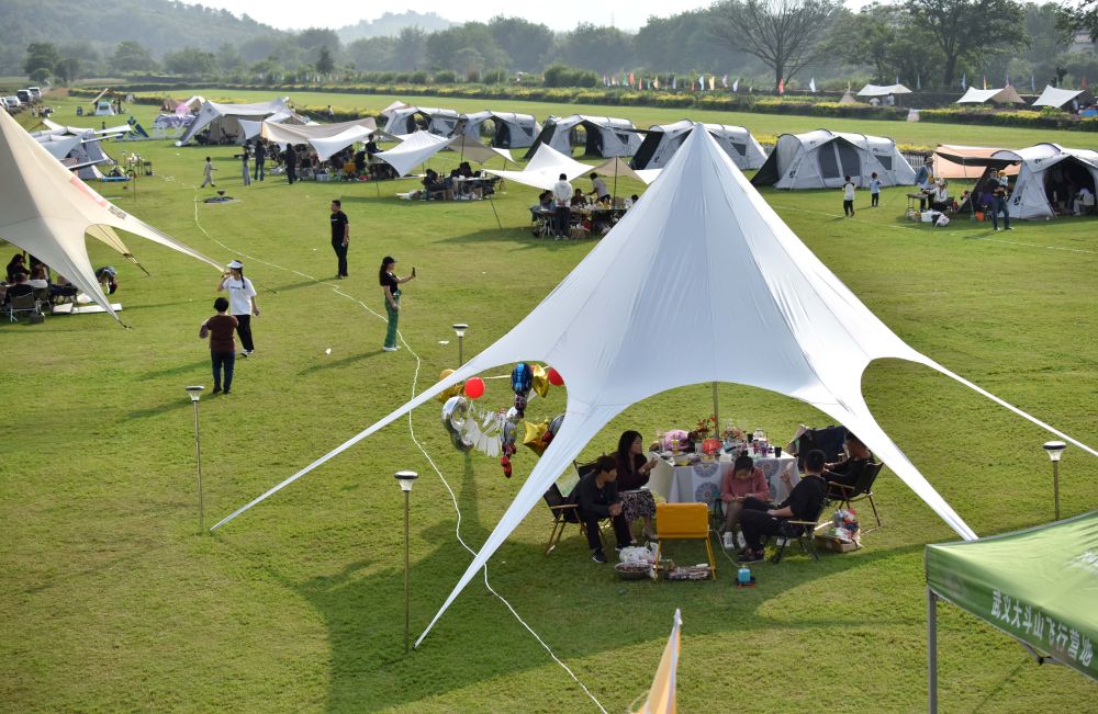 5月2日,游客在浙江省武義縣大斗山飛行營地的大草坪體驗帳篷露營休閑游。(新華社發)