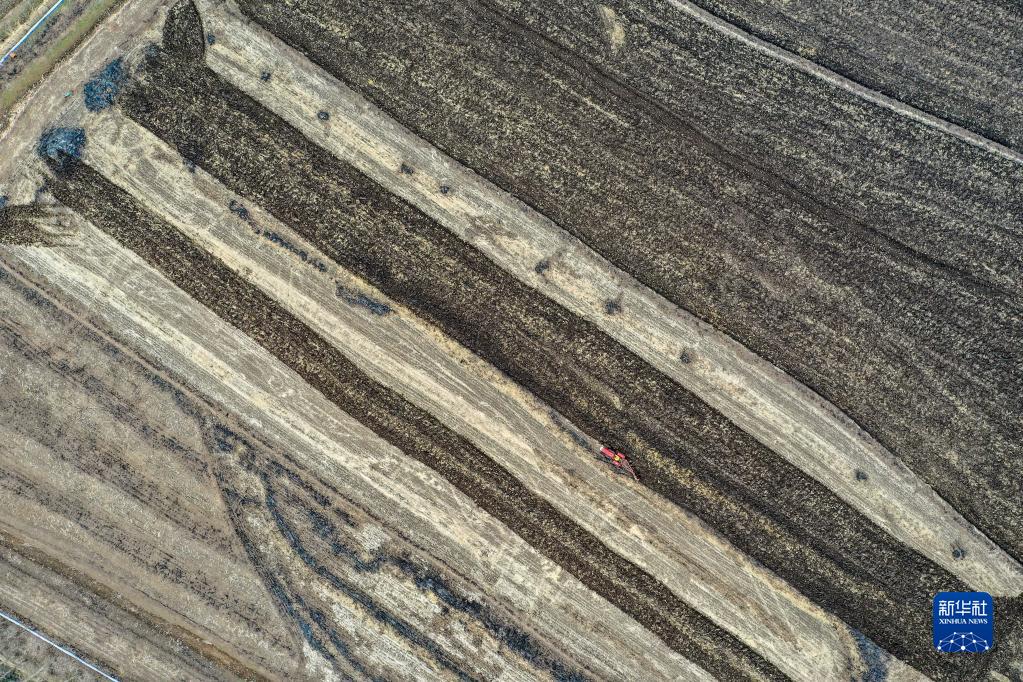 在吉林省吉林市昌邑區孤店子鎮紅衛村,春新生態家庭農場農民駕駛農機耕地(4月26日攝,無人機照片)。新華社記者 張楠 攝
