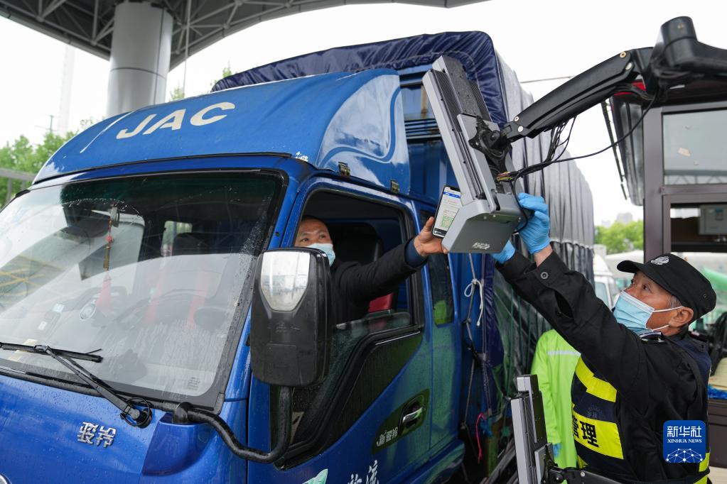 在安徽合肥百大周谷堆大興農產品物流園,司機在智能化門禁系統上掃碼進入(4月13日攝)。該園建立集測溫、核驗安康碼、數據收集等功能的智能化門禁系統,進場駕乘人員不用下車即可快速核驗,實現防疫測溫智能化、人車追溯數據化。新華社記者杜宇攝