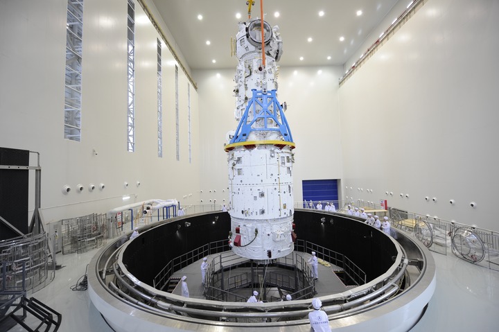 在中國航天科技集團五院天津基地內,天和核心艙在進行熱試驗前吊裝(資料照片)。新華社發(航天科技集團五院供圖)