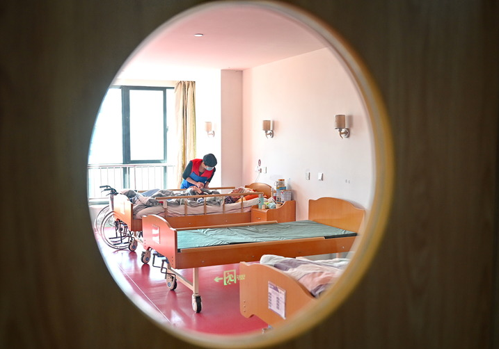 2021年11月25日,青鳥頤居(晉江)養老服務有限公司護理人員在晉江市社會福利中心為參保長護險的老人服務。新華社記者 林善傳 攝