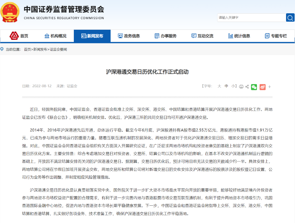 中國證監會8月12日表示,近日,經國務院同意,中國證監會、香港證監會批準上交所、深交所、港交所、中國結算和香港結算開展滬深港通交易日歷優化工作。優化后,滬深港三所的共同交易日均可開通滬深港通交易。