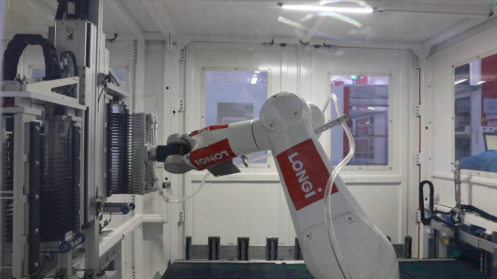 西安隆基樂葉是光伏企業(yè)隆基綠能科技股份有限公司位于西安的單晶硅太陽能電池生產(chǎn)廠。生產(chǎn)車間,隨處可見的機(jī)器人“搬運(yùn)工”將物料送到指定地點(diǎn);操作間里,伴隨機(jī)械手臂的起落,硅片的鍍膜順利完成……從制絨到鍍膜、再到印刷燒結(jié),每一道工序都有條不紊。