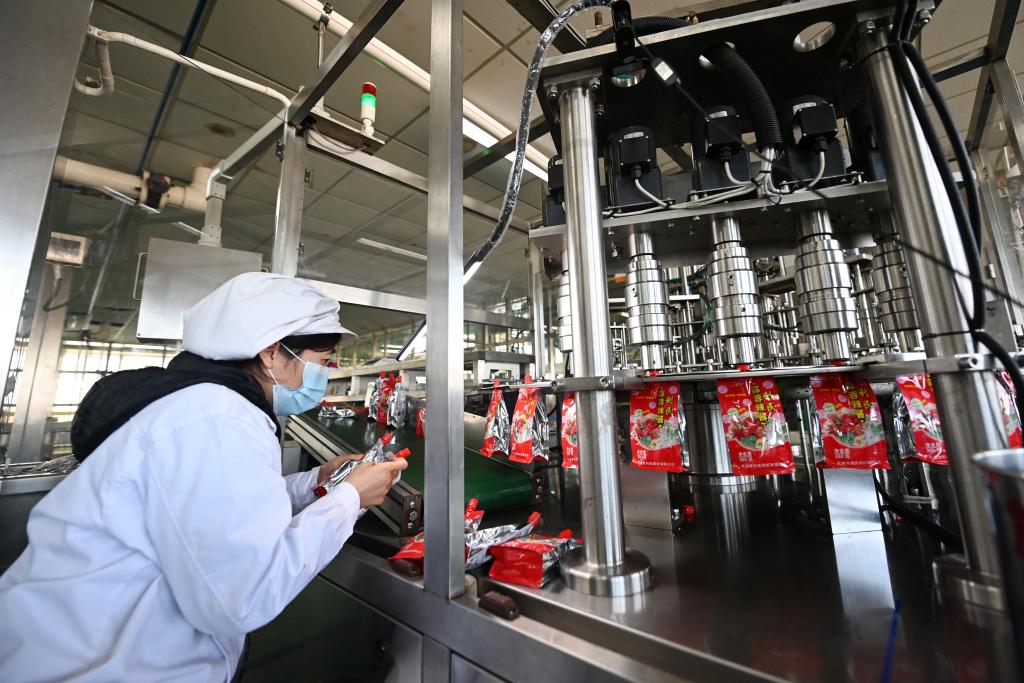 在天津市利民調料有限公司辣醬灌裝生產線,工作人員在檢查產品包裝(2月20日攝)。新華社記者 趙子碩 攝