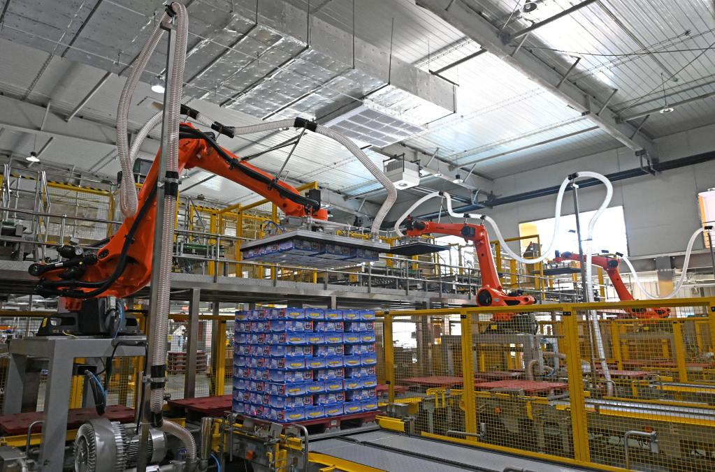 在天津海河乳品有限公司智能化生產線,智能生產設備在轉運貨物(2月20日攝)。新華社記者 趙子碩 攝