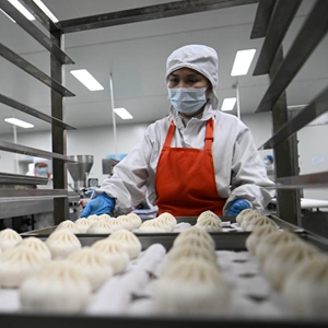 天津利達糧油有限公司速凍面食生產車間,工作人員在搬運速凍包子(2月23日攝)。新華社記者 趙子碩 攝