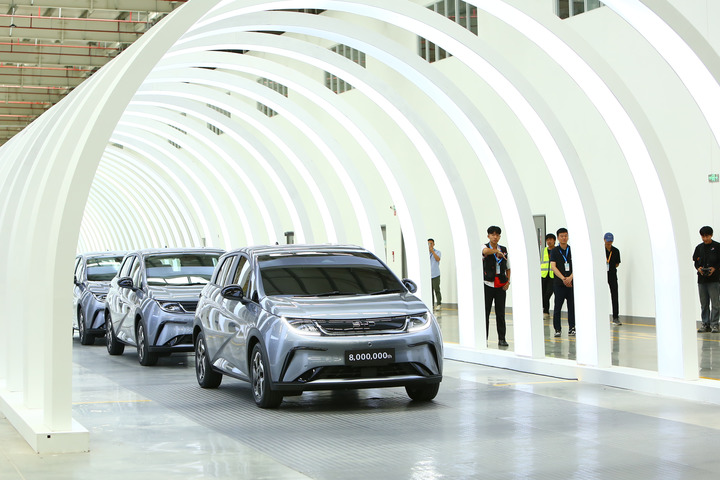 7月4日,在位于泰国罗勇府的比亚迪泰国工厂,比亚迪第800万辆新能源汽车在仪式上亮相。 新华社记者 孙玮彤 摄