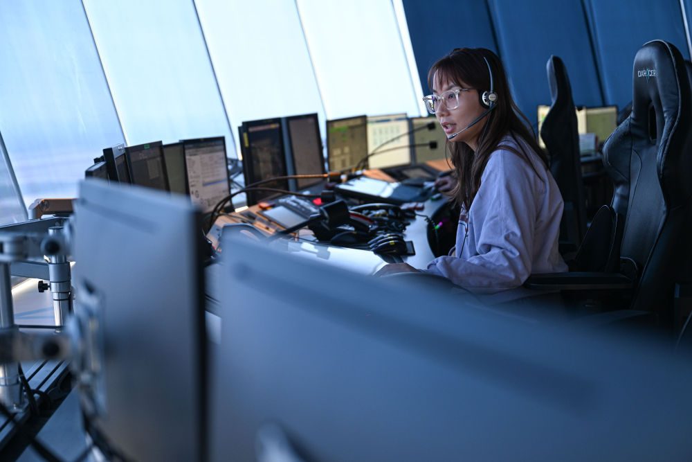 2025年1月19日,在海口美兰国际机场塔台,民航海南空管分局塔台管制员指挥民航客机在该机场起降。新华社记者 蒲晓旭 摄