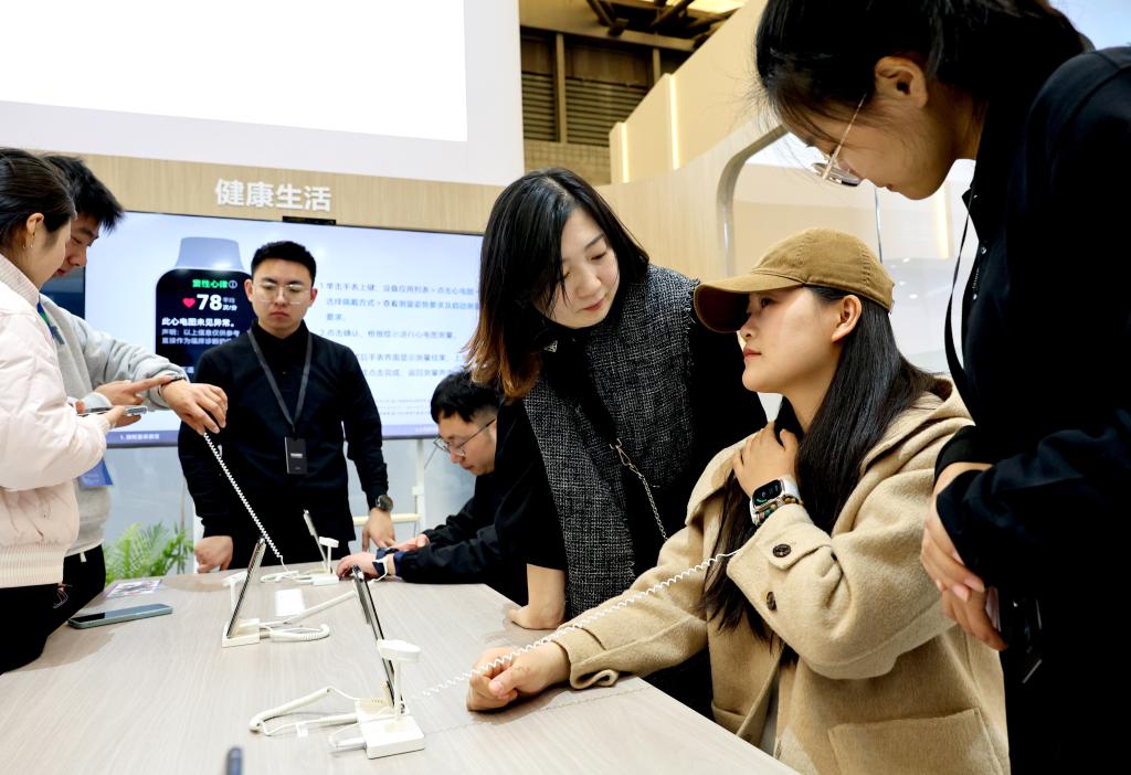 一位参观者(右二)在2025中国家电及消费电子博览会(AWE2025)体验智能手表的腕部动态血压记录仪功能。新华社记者方喆 摄