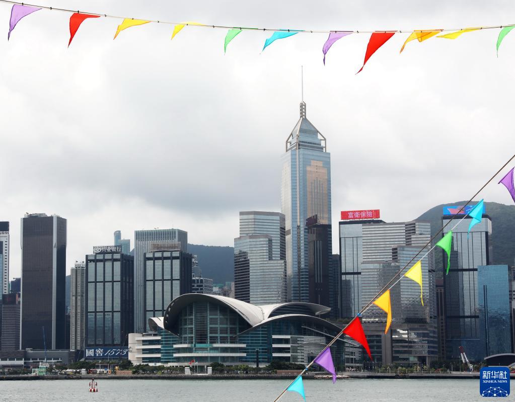 在香港尖沙咀,中華人民共和國國旗和香港特別行政區(qū)區(qū)旗一起迎風(fēng)飄揚(yáng)( 6月29日攝)。新華社記者 李鋼 攝