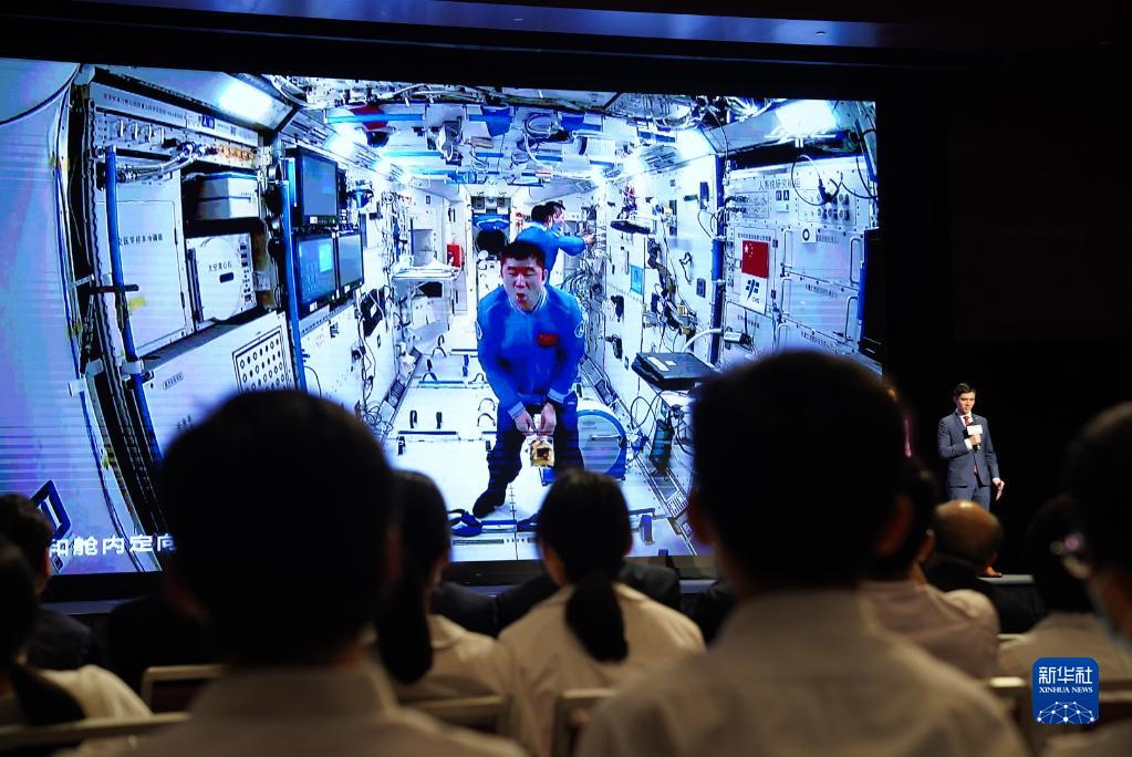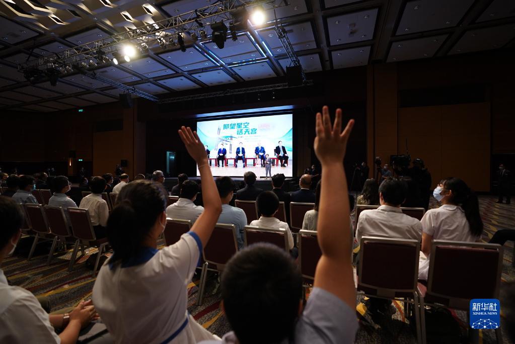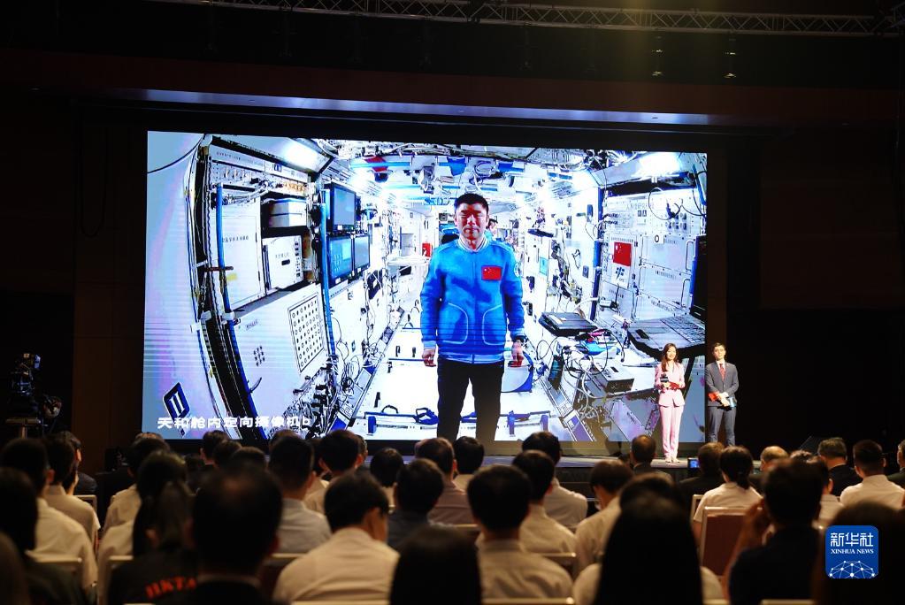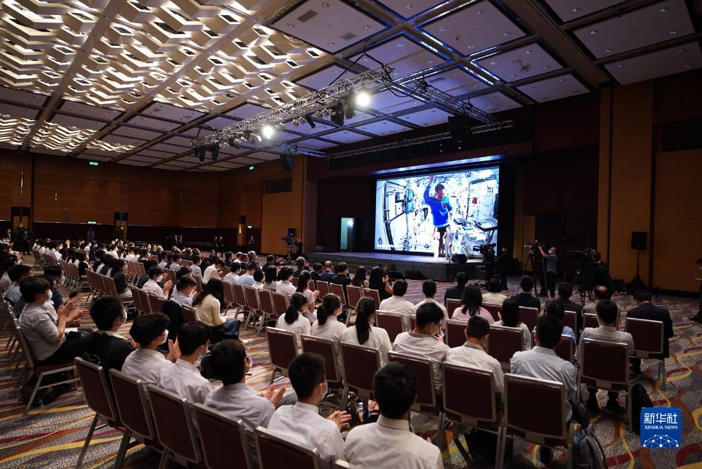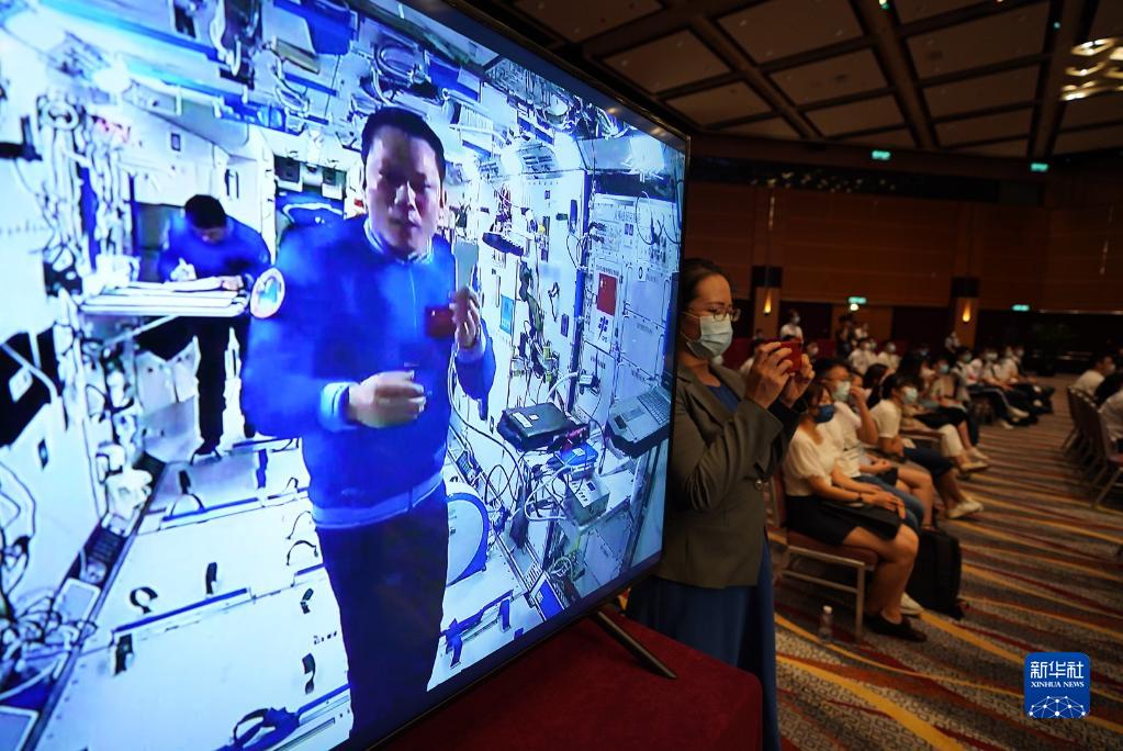 9月3日,正在天宮空間站執(zhí)行任務的神舟十二號乘組與香港科技工作者、教師和大中學生進行天地連線互動。新華社記者 呂小煒 攝