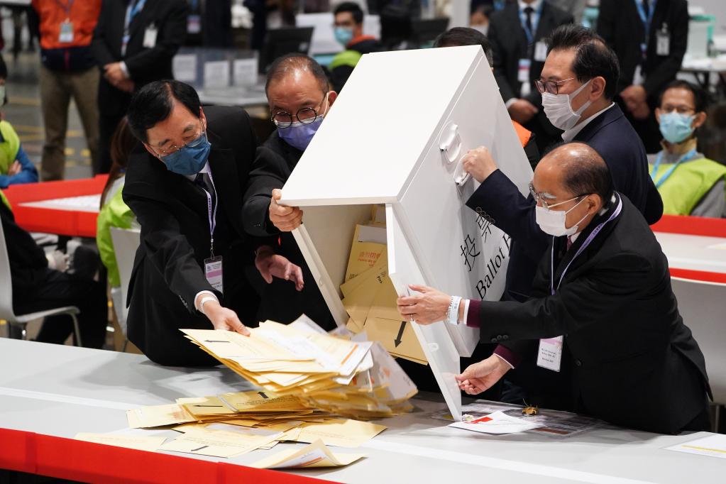 12月19日,香港特區(qū)選舉管理委員會主席馮驊(右二)打開票箱。香港特別行政區(qū)第七屆立法會選舉投票于19日約23時順利結(jié)束。這是完善選舉制度后香港特區(qū)舉行的首次立法會選舉。新華社記者 呂小煒攝