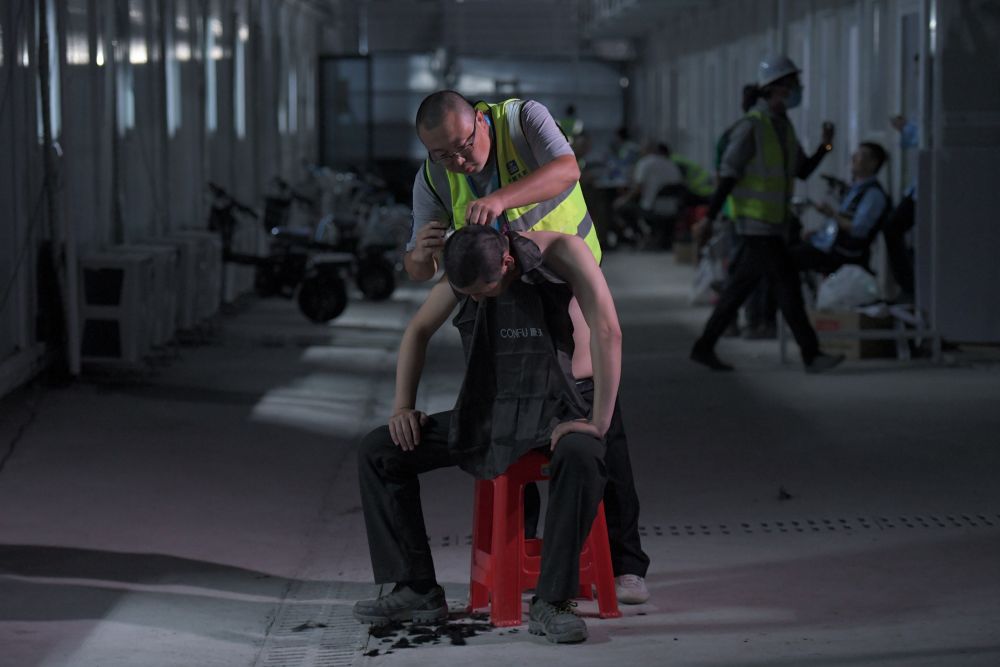 3月17日晚上,借著一點燈光,建設者互相幫忙理發。