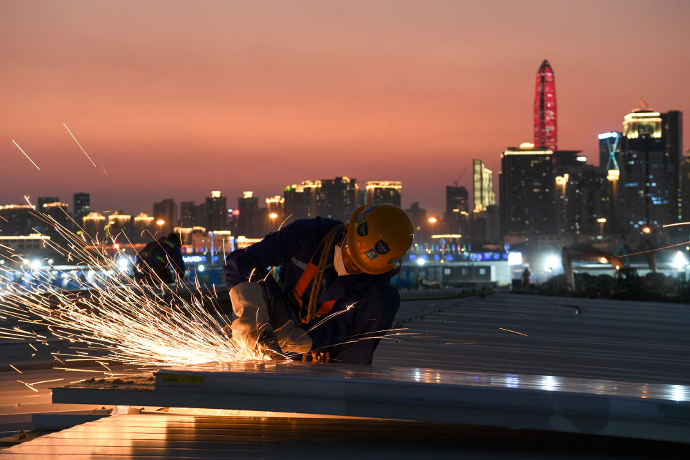 4月8日傍晚,一名工人在應急醫院屋頂施工,他的身后是深圳萬家燈火。