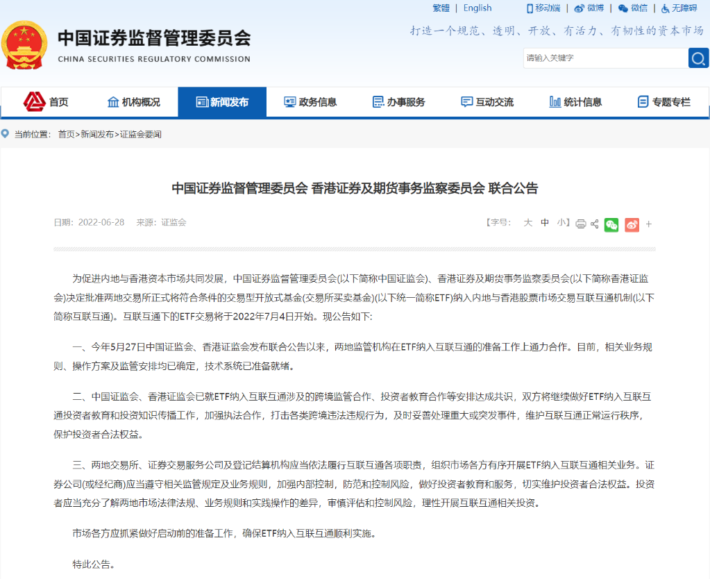 中國證監會、香港證監會28日宣布,互聯互通(內地與香港股票市場交易互聯互通機制)下的ETF(交易型開放式基金)交易將于2022年7月4日開始。