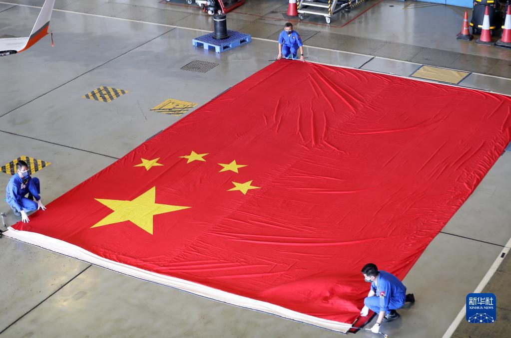 直升機務教官蔡澤民套上鞋套,戴上白手套,拿著夾有《國旗及國徽條例》的文件夾,一一對照檢查。國旗是在具備資質的廠家專門定制的,規(guī)格規(guī)范都有嚴格要求。國旗大,就有拼接。蔡澤民主要查看色澤是否飽滿和均勻,接縫是否平整,四條邊上有沒有線頭等,特別要注意的是,五顆星星處不可有接縫。一番操作下來,后背已然濕透。