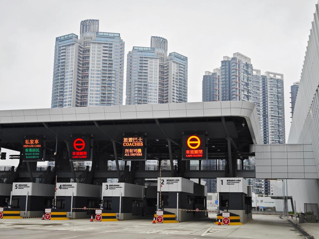 路的終點是一棟外觀頗具流動感的長方體建筑。這里是港深第七個、也是最新落成的陸路口岸——蓮塘/香園圍口岸。它橫跨深圳河,兩地旅檢大樓連為一體,好像一座橋。