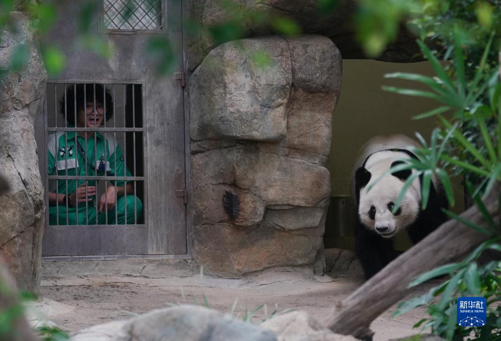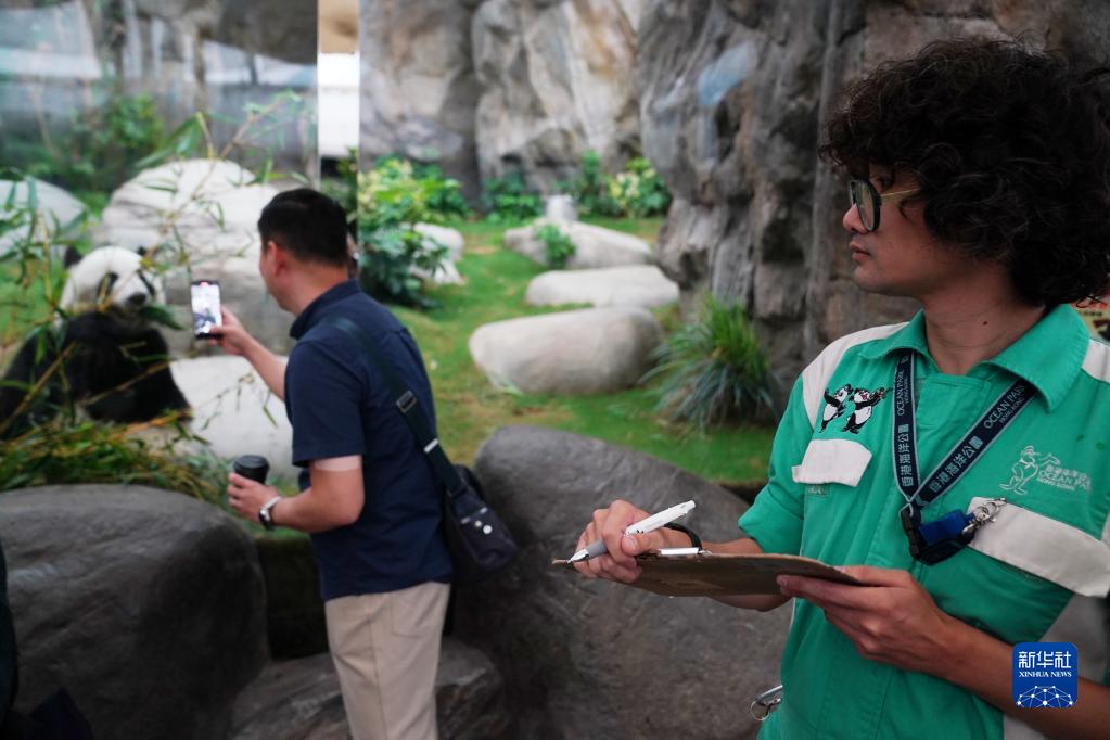 在香港海洋公園,大熊貓“奶爸”梁家綸(右)觀察大熊貓“盈盈”的狀態(tài)(4月19日攝)。新華社記者 王申 攝