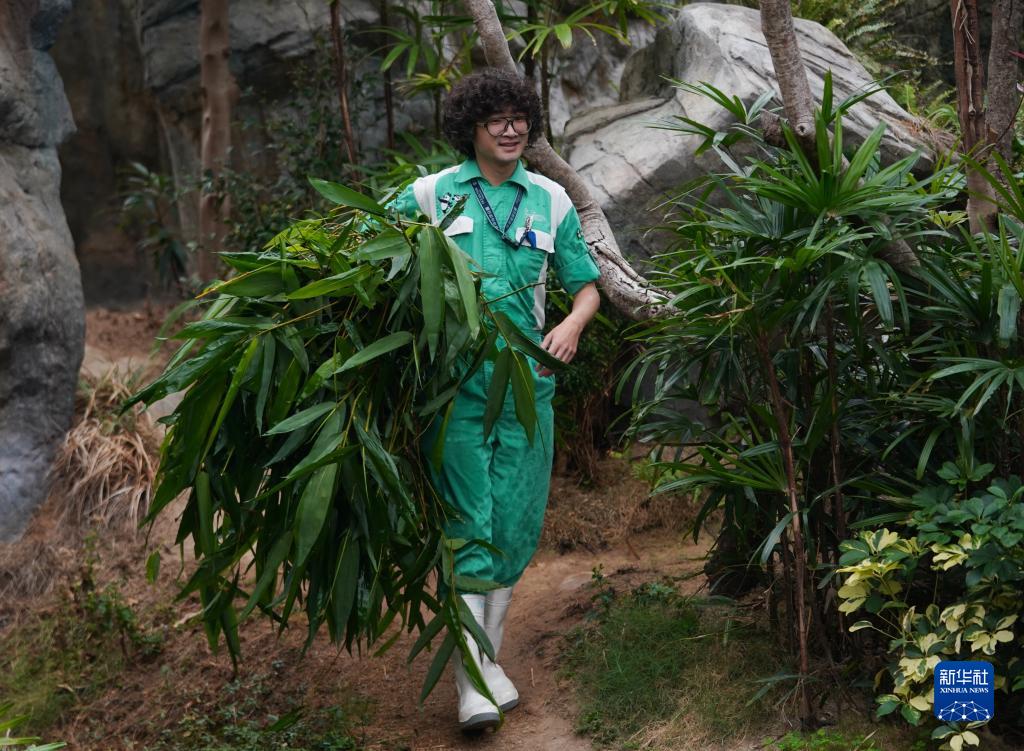 在香港海洋公園,梁家綸為大熊貓“樂樂”和“盈盈”準備早餐(4月19日攝)。新華社記者 王申 攝