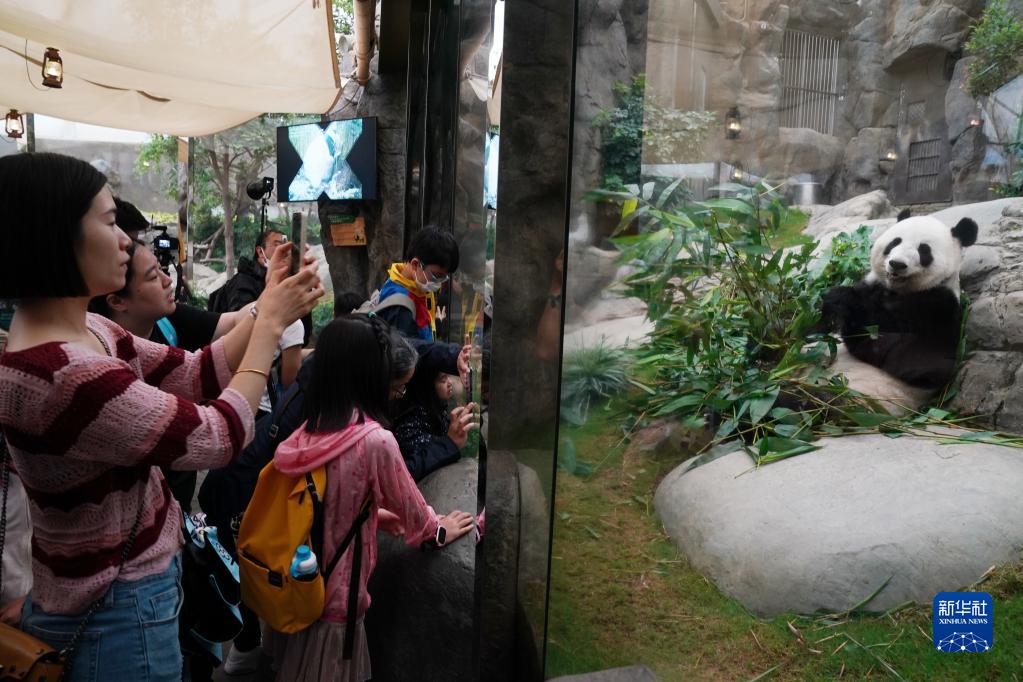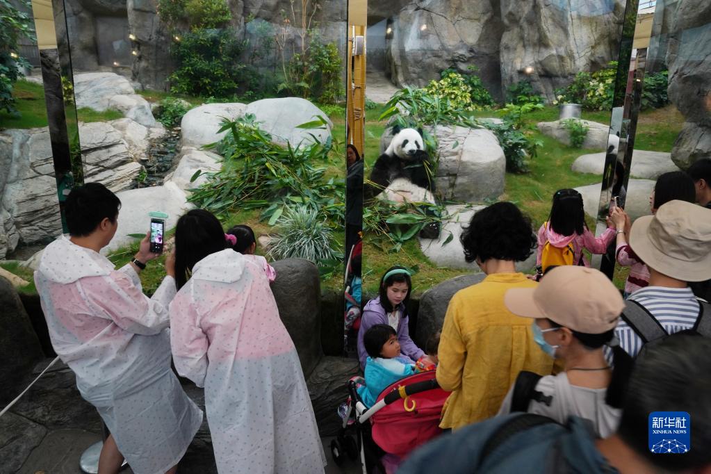 在香港海洋公園,游客和大熊貓“盈盈”合影(4月19日攝)。新華社記者 王申 攝